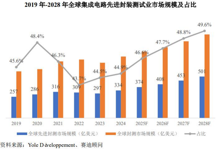 先进封装测试占整体封测的比例逐步提高。2024年先进封装测试业市场规模占比达44.9%,市场预测,2028年先进封装测试业市场规模占比将近50%。