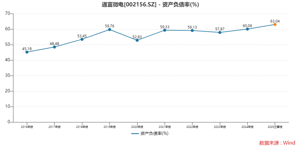 集成电路封测行业为资金密集型,通富微电资产负债率已是上市以来新高。2024年末公司资产负债率首次突破60%,截至2025年三季度末,资产负债率为63.04%,较上年末又增加了约3个百分点。