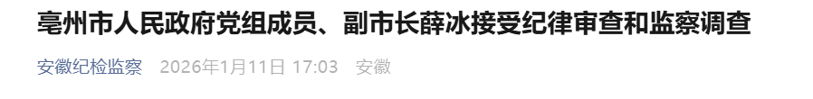 亳州市人民政府党组成员、副市长薛冰涉嫌严重违纪违法,目前正接受安徽省纪委监委纪律审查和监察调查。(安徽省纪委监委)