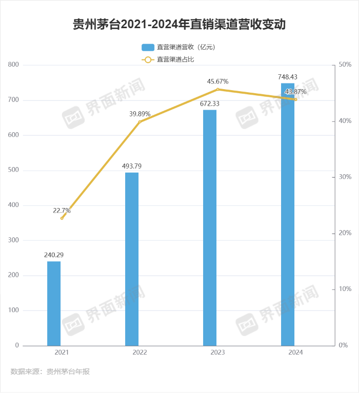 2022年3月,i茅台上线,当年贡献收入493.79亿元,致其直营渠道占比达到39.89%。2024年,营收达到748.43亿元,占比为43.87%。