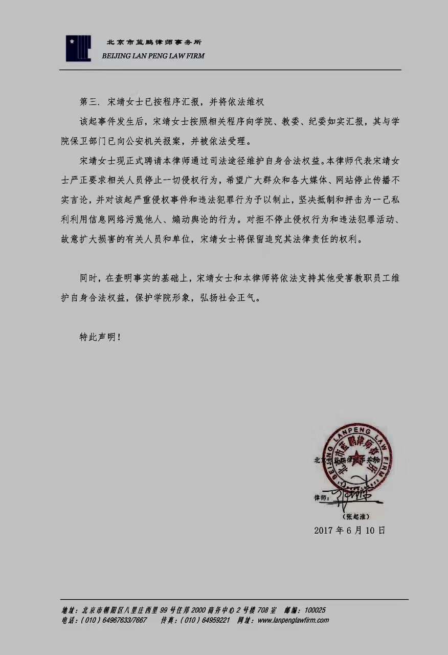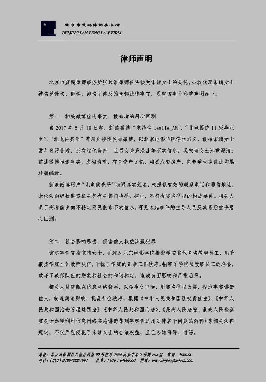 北京电影学院老师被举报存在贪污受贿事件持续发酵,2017年6月10日晚,曾代理王宝强离婚案的张起淮发布律师声明称,已依法接受宋靖女士的委托,全权代理宋靖女士被名誉侵权、侮辱、诽谤所涉及的全部法律事宜。“现宋靖女士郑重澄清:前述微博捏造事实,虚构情节,有关资产过亿、购买八套房产、包养学生等说法均属杜撰编造。”