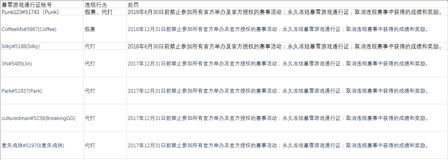 6月10日,暴雪网易发布公告,宣布对部分于《星际争霸2》官方及官方授权赛事活动中参与代打、假赛行为的选手依违规情节进行处罚,根据处罚决定,共有7名选手遭到不同程度的禁赛、封号处罚。