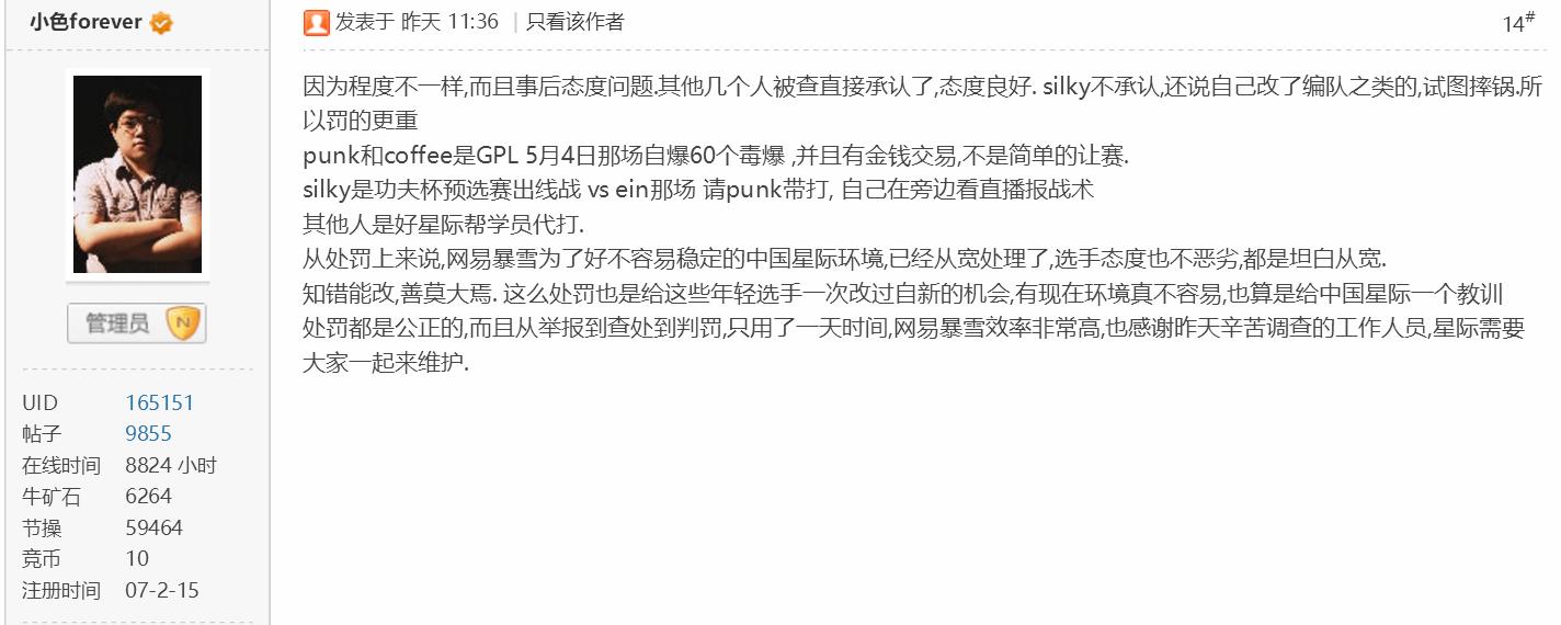 Silky是在功夫杯预选赛中,由其他选手代打,并在旁边看直播报战术。其他受处罚的的选手则是在《中国好星际》节目中帮助学员代打。
