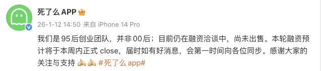 1月12日下午,@死了么App 发文表示,“我们是95后创业团队,并非00后;目前仍在融资洽谈中,尚未出售。本轮融资预计将于本周内正式close,届时如有好消息,会第一时间向各位同步。”