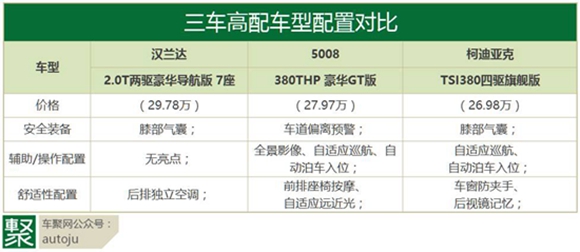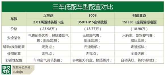 5008入门版车型配置比较均衡,安全配置和汉兰达一样配置了头部和侧方气帘,并且还提供换挡拨片。综合而言,除了汉兰达配置略低,5008和柯迪亚克各有所长,但入门版车型的配置还是有些吝啬,真皮电动座椅等方便配置还是有些缺失。