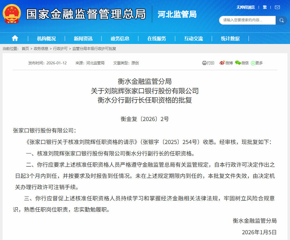 据国家金融监督管理总局河北监管局的批复文件显示,衡水金融监管分局同意刘院辉出任张家口银行衡水分行副行长。
