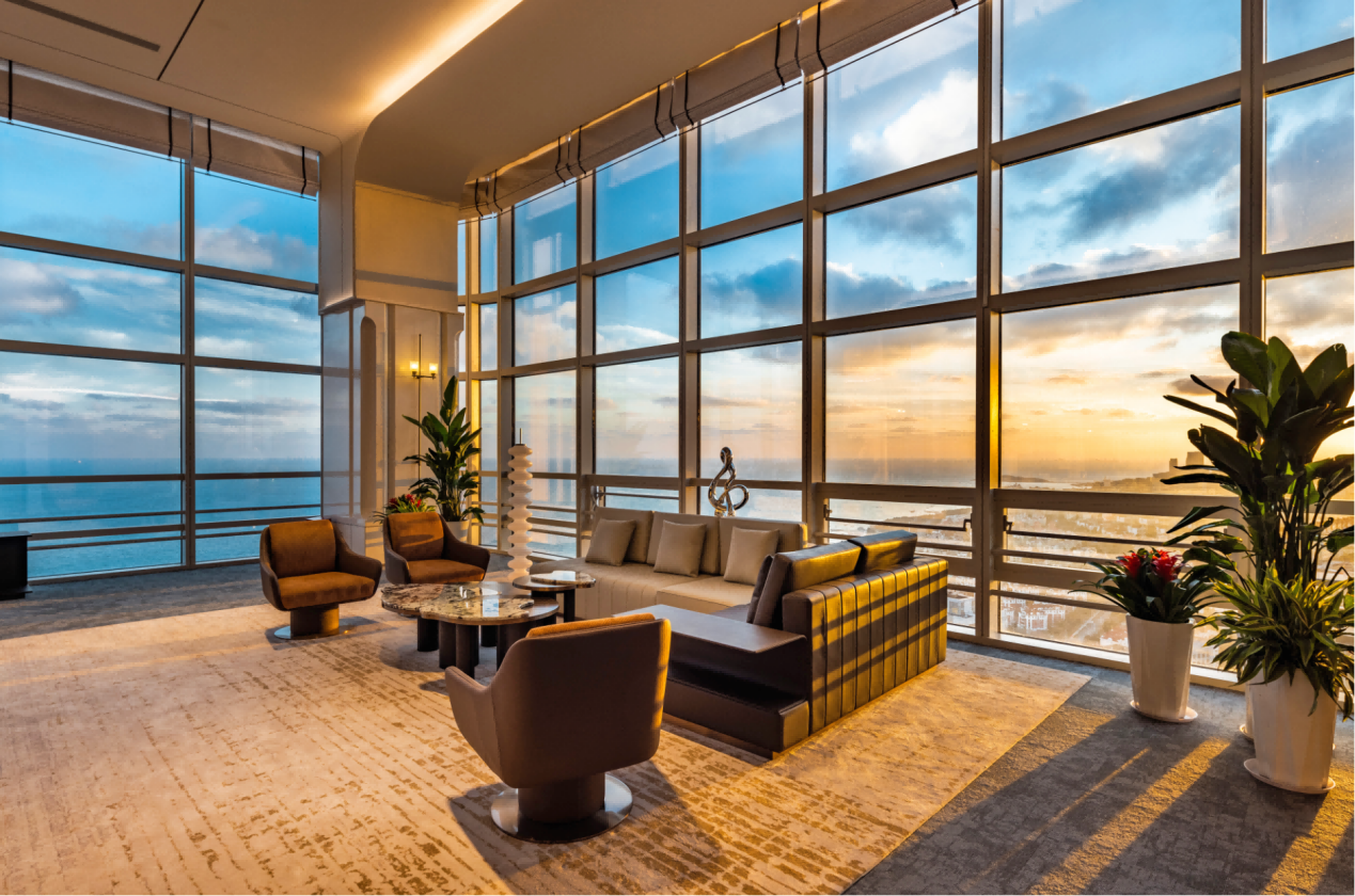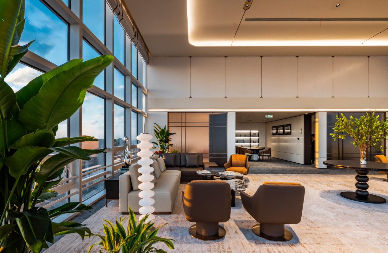 空间承载雄心,设计赋能未来。活动现场,39-40F“云端会客厅”样板层首次揭开面纱。区别于传统办公布局,项目创新打造“共享层”理念,以「功能适配+美学赋能」为核心,构建全维度高端商务生态。