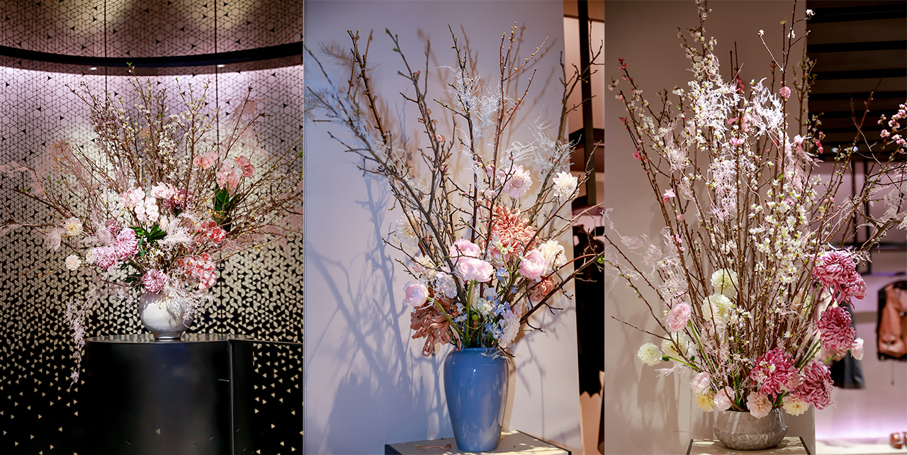活动现场以「旷野诗意」为脉络,将主题元素嵌入每一处空间细节。错落布置的多组东方花艺自成一体风景,呼应系列中「野」的松弛感,与服饰的诗意风骨相映成趣。