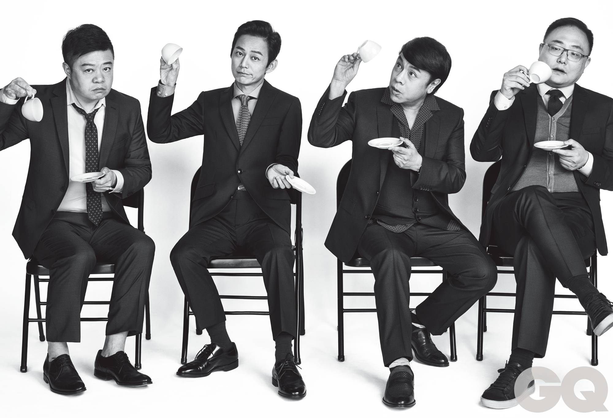 马东:深蓝色西装 白色衬衫 黑色皮鞋 均为 Boss 深蓝色印花领带 Gucci | 何炅:深蓝色西装 姜黄色衬衫 均为 Boss 黑色系带皮鞋 Prada 编织领带 Kiton | 蔡康永:深蓝色三件套西装 深蓝色印花衬衫 黑色皮鞋 均为 Boss | 罗振宇:深蓝色西装 白色衬衫 黑色系带运动鞋 均为 Boss 宝蓝色针织开衫 Kiton 编织领带 Suitsupply