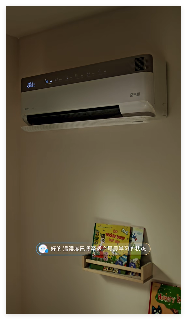 当孩子在书桌前安稳入座,护眼大路灯即刻亮起,窗帘自动关闭,让柔和均匀的光线铺满桌面。与此同时,空调自动切换至无风感模式,轻柔暖风悄然环绕,既保证室内温暖舒适,又避免直吹。学习时间长了,空调还会自动提醒休息,在这样的贴心守护下,孩子能全身心沉浸在知识的海洋,尽情享受充实又惬意的寒假学习生活。