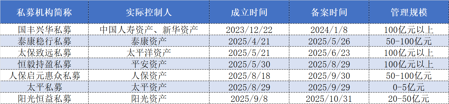 界面新闻梳理发现,截至今年1月14日,一共有7家险资系证券私募已经在中基协完成登记备案。从管理规模来看,在恒毅持盈私募和人保启元惠众私募之前,国丰兴华私募和太保致远私募已经率先突破百亿规模大关,泰康稳行私募也早已进入50-100亿元区间,阳光恒益私募目前的管理规模居于20-50亿元区间,仅剩太平私募仍停留在0-5亿元区间。