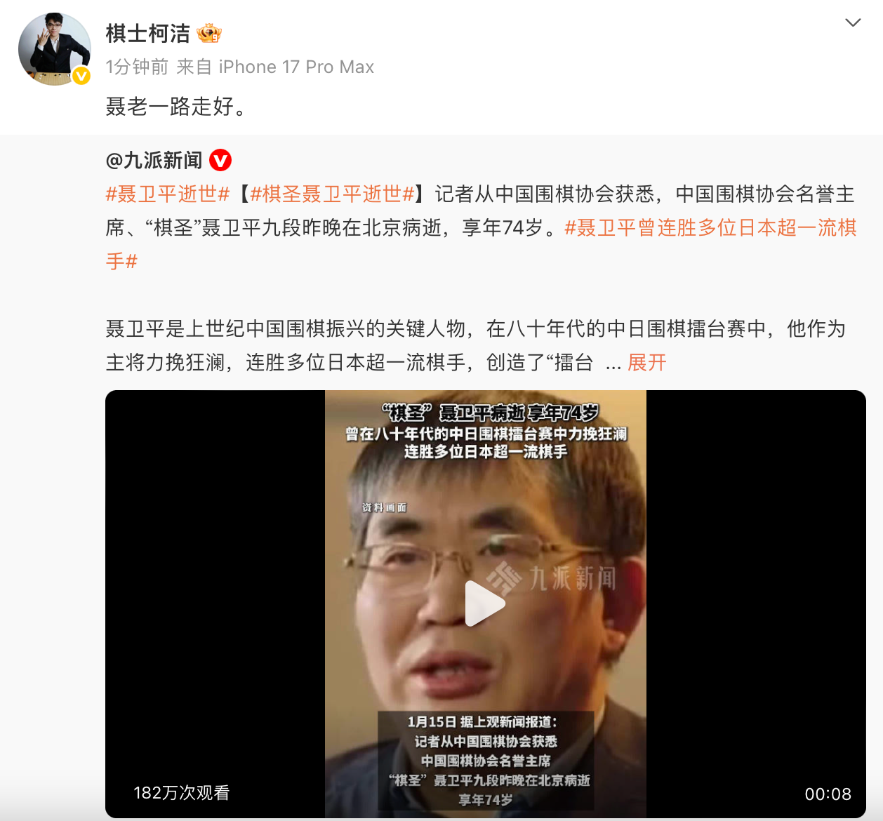 1月15日,中国围棋协会发布消息:中国围棋协会名誉主席、“棋圣”聂卫平九段,因病医治无效,于2026年1月14日22时55分在北京逝世,享年74岁。随后,@棋士柯洁 发文:“聂老一路走好。”
