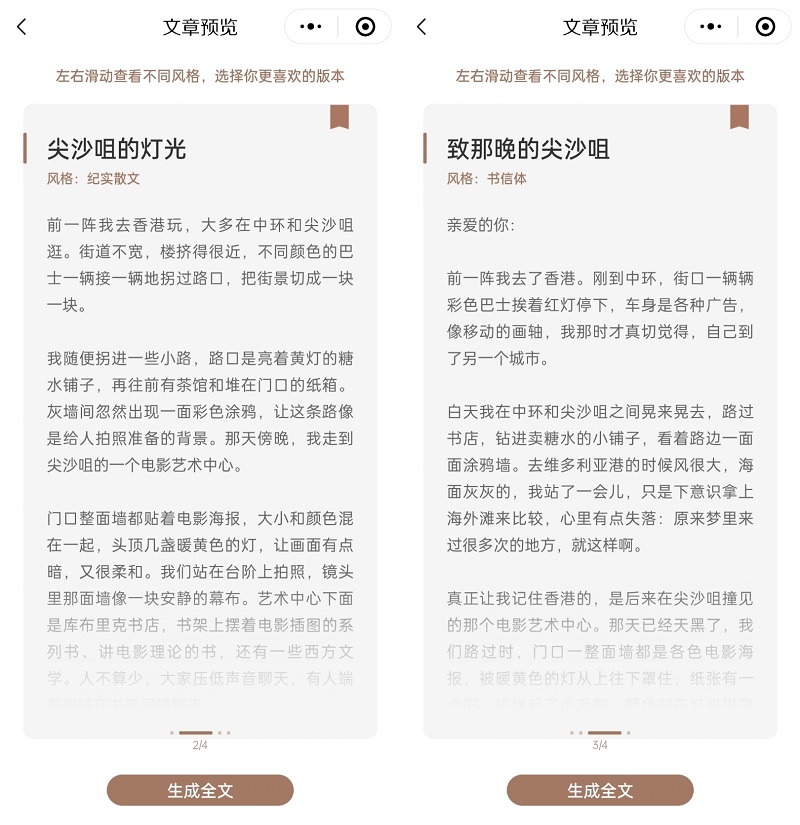 随后,“AI写作者”会将这些碎片化的口语对话,清洗、重构、润色,一键生成为结构严谨、文笔流畅的回忆录。在V0.2版本中,这一角色的创作维度也得到了拓展:AI写作者会智能检索并补充当年的社会风貌与时代背景,让故事不再悬浮孤立;同时也更新了多种文风选择,用户在生成文章前可指定叙事回忆录、纪实散文、书信体、“鲁迅风”这四种写作风格。针对不同底色的人生故事,匹配最合适的叙述口吻,提升文章的个性化与区分度。