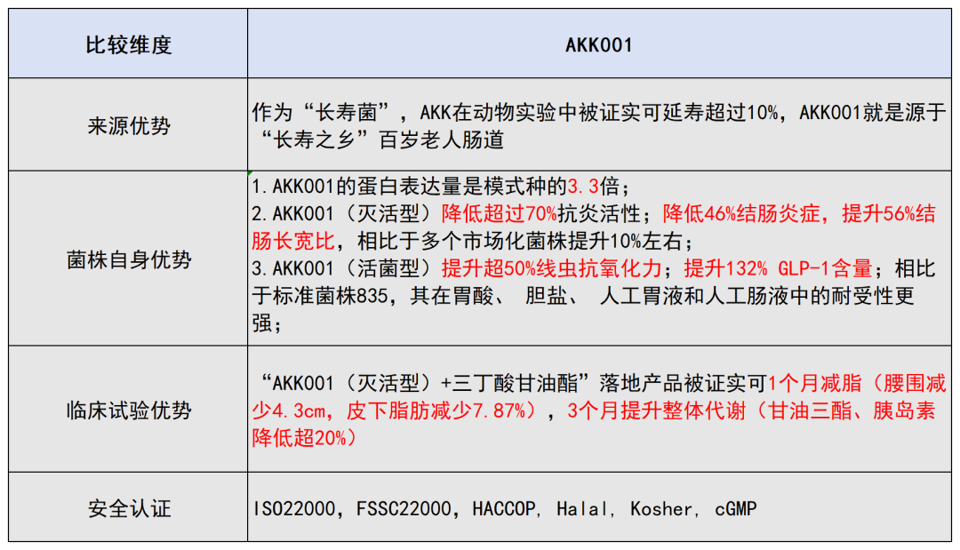 相比于市售菌株,原衍生物的专利菌AKK001在以下几方面具有一定优势: