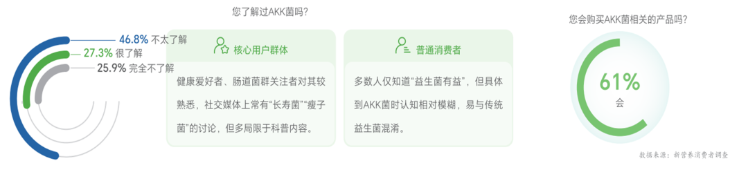 行业人士表示,AKK菌市场仍处于蓝海开拓期,消费者认知度仍不足30%。新营养消费者调查数据显示,市场用户对于AKK菌相关产品的购买意愿高达61%,呈现出鲜明的“低认知、高需求”特征,增长空间巨大。