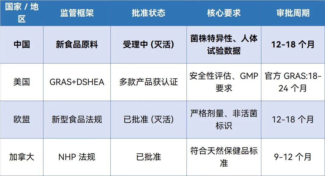 与此同时,政策层面的利好更让这片市场加速升温。目前,AKK菌在欧美已通过GRAS(美国)和新食品原料(欧盟)审批,而中国也在2025年11月正式受理首株灭活AKK菌的新食品原料申请,标志着国内市场的政策闸门即将打开。