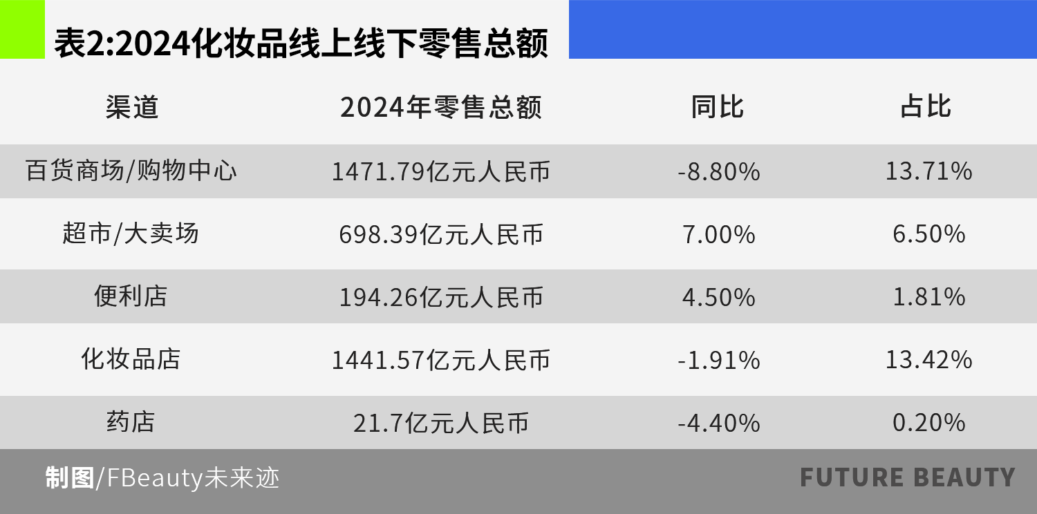 2023年,购物中心和百货在化妆品全渠道零售总额的市场占有率约为15.41%,化妆品店渠道约为14.03%;2024年购物中心和百货下降到13.71%,化妆品店渠道保持在13.42%。二者之间的差距明显缩小。