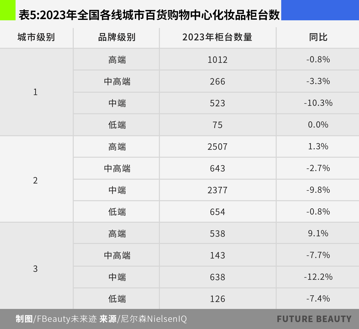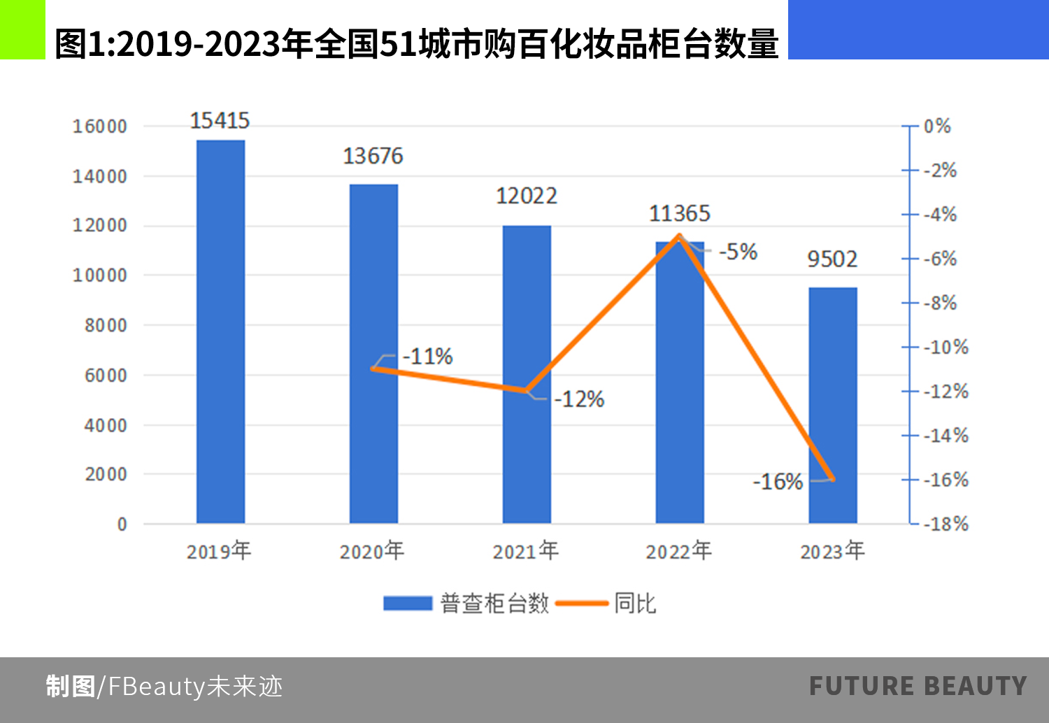 据尼尔森对51个重点城市的监测,2019年百货商场化妆品柜台的总数约为15415个到2023年锐减至9502个,总数减少5913个。