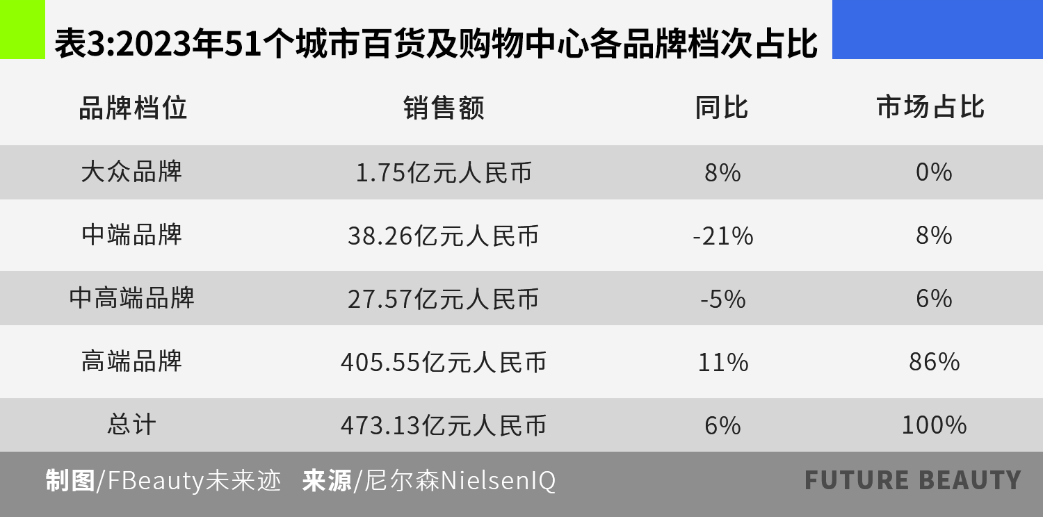 尼尔森的统计数据显示,2023年百货渠道高端品牌的销售额占比达到86%,大众品牌的占比只有0.0037%,几乎可以忽略不计。