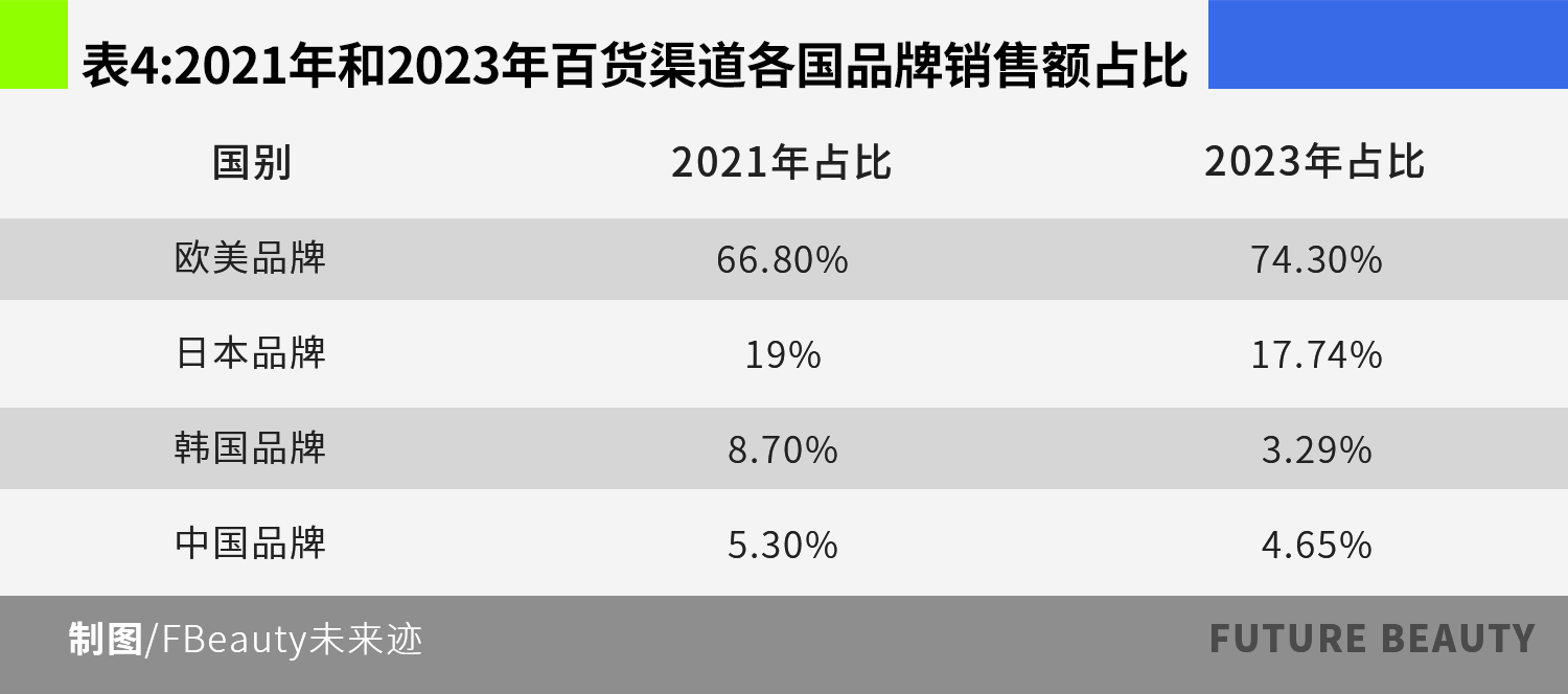 从品牌归属地所在国别统计,百货渠道的化妆品零售总额中欧美品牌占据绝对主导,占比从2021年的66.8%上升到了2023年的74.3%,日韩和中国品牌则均呈现下滑趋势。其中韩国品牌下滑幅度最大,从2021年的8.7%下滑到2023年的3.29%。