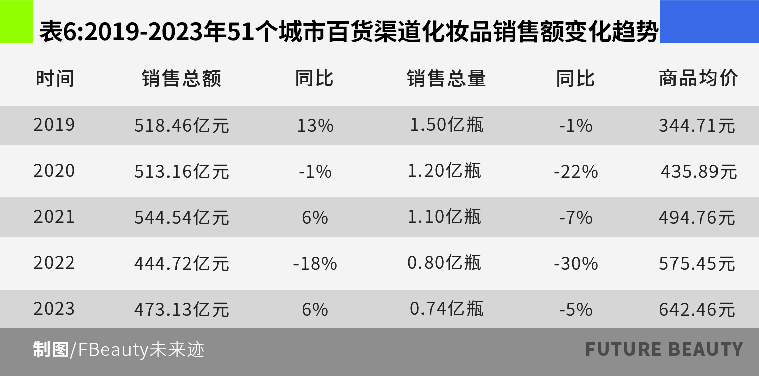 尼尔森的数据显示,51个重点城市的百货专柜2019年化妆品的总销售额为518.46亿元,2023年下滑到473.13亿元。与此同时,平均商品均价从344.71元飙升到642.46元,5年上涨86.38%。