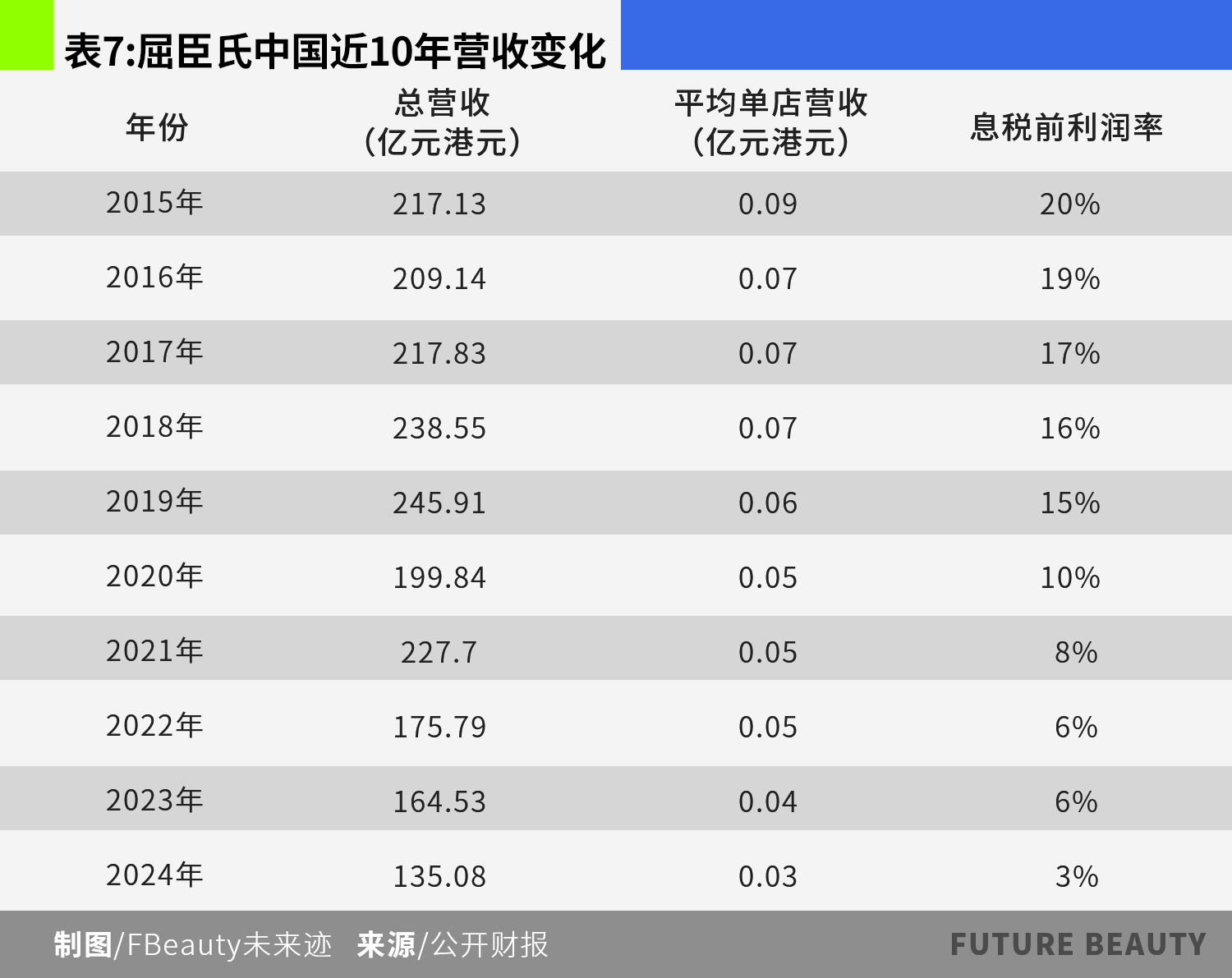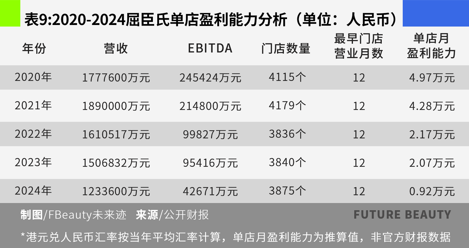 以屈臣氏为例,公开财报显示,2015年至2019年,屈臣氏中国的营收始终保持正增长,2019年至2024年整体呈现下行趋势。2024年总营收135.08亿港元,和最高峰2019年营收245.91亿港元相比,下降了45.07%。与此同时,平均单店产出从900万港元/年下降到300万港元/年,下降了66.7%。息税前(EBITDA)利润率也从最高20%下降到3%,下降幅度达85%。