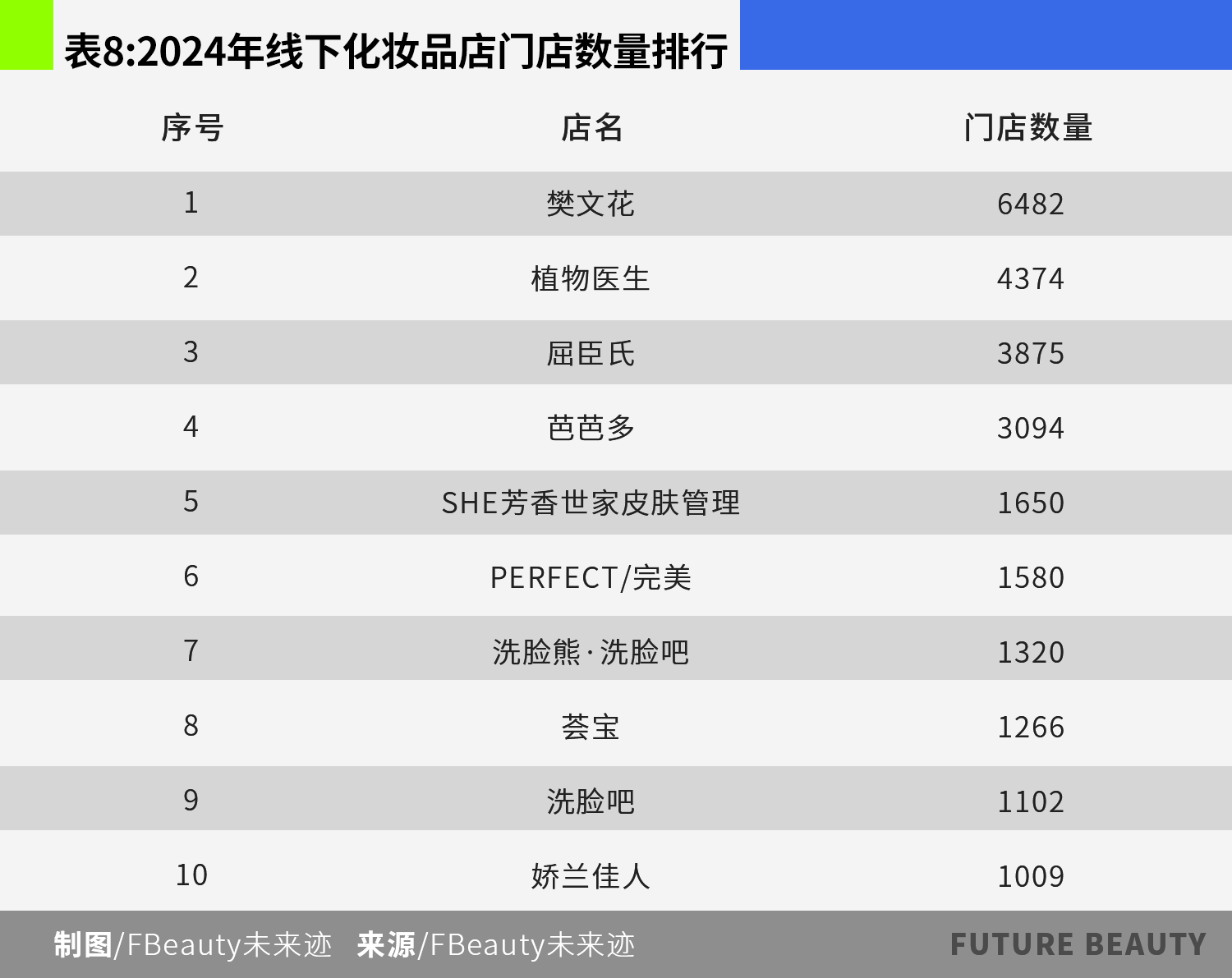 如果单纯以门店数量计算,2024年排名前十的化妆品门店中,樊文花、植物医生、芭芭多、洗脸熊、荟宝、洗脸吧都是以提供轻美容服务为主的店铺,门店面积普遍在30-60平方米,布置1-2张美容床,提供面部清洁、眼周按摩等轻美容服务并销售配套产品。