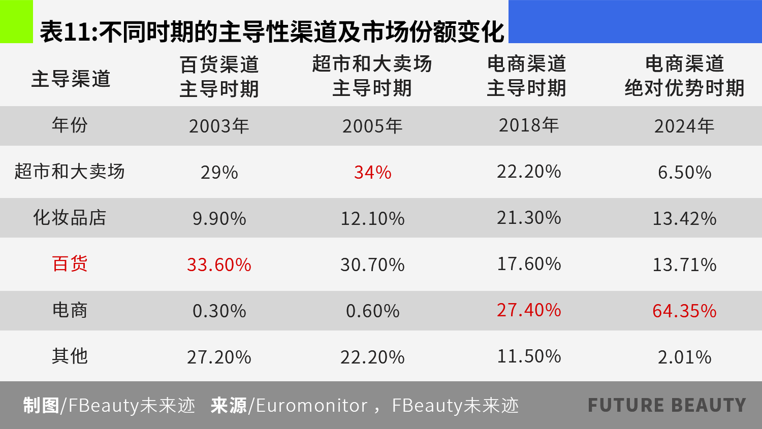 超市和大卖场,作为传统的零售渠道,曾经是化妆品销售的主要场所。Euromonitor的数据显示,高峰时期(2006年-2009年)超市和大卖场曾占据化妆品全渠道销售额的34%以上,是当时的化妆品第一大销售渠道。