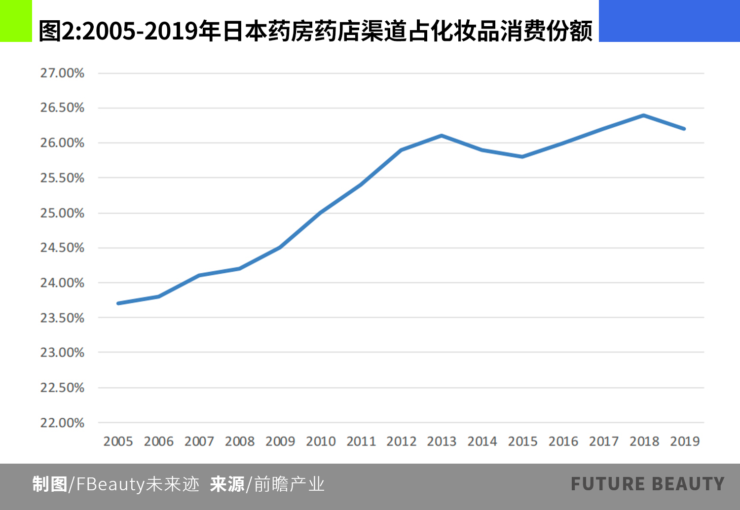 前瞻产业研究的数据显示,2005年日本药房渠道占化妆品消费的比例约为23.5%,到2019年已经上升到26%以上。