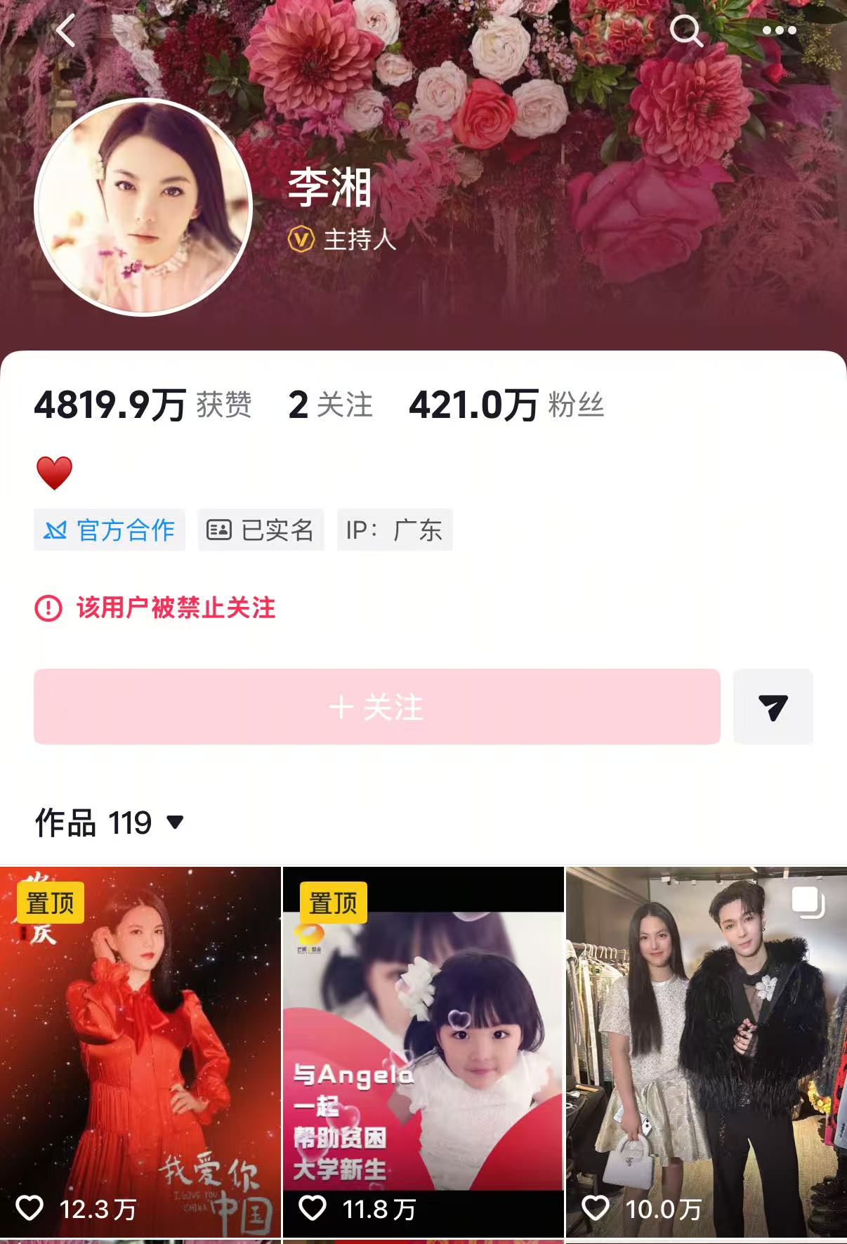 1月16日,李湘账号在微博、抖音、小红书平台被禁止关注。
