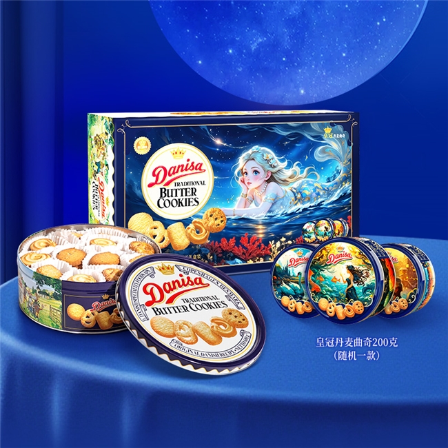 具有“高颜值”设计的皇冠丹麦曲奇饼干礼盒装900g,美人鱼悠然于海面上,童话故事感满满,大规格适合家人团聚、礼赠亲友、朋友相聚等多人畅享场景。5款经典的黄油曲奇历经匠心烘焙,带来酥脆美味。
