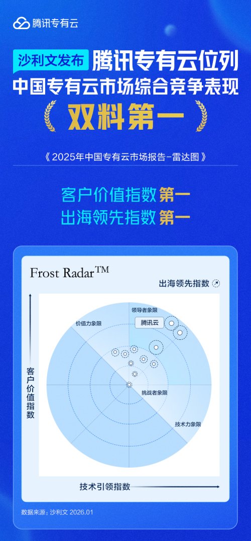 1月15日,国际知名咨询机构弗若斯特沙利文(Frost&Sullivan)联合头豹研究院发布了《2025年中国专有云市场研究报告-雷达图》。报告显示,由于专有云在迁移成本、安全合规、内部系统集成等维度的天然优势,正在快速成为“智能化”与“出海”企业依赖的智算基础设施。腾讯专有云TCE在本次评测的“Frost Radar”中强势位居领导者象限,其中“客户价值指数”位列第一、“出海领先指数”位列第一,“技术引领指数”同样基于优势位置,充分彰显了腾讯专有云TCE作为行业领军者的综合实力与市场影响力。
