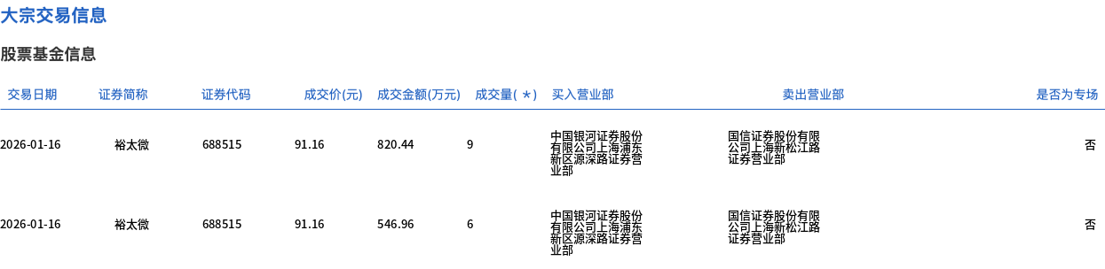 1月16日,裕太微大宗交易成交15万股,成交额1367.4万元,占当日总成交额的3.48%,成交价91.16元,较市场收盘价120.21元折价24.17%。