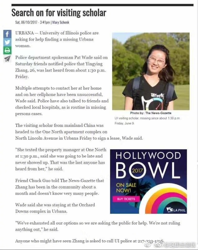 伊利诺伊大学警察署的网站上发表寻人声明:我们不知道张女士现在是否处于危险之中,但伊利诺伊大学警察署正在竭尽所能地寻找她。如果有人知道有关张女士的信息,请告诉我们。即使是小块信息也可能会有很大的帮助。