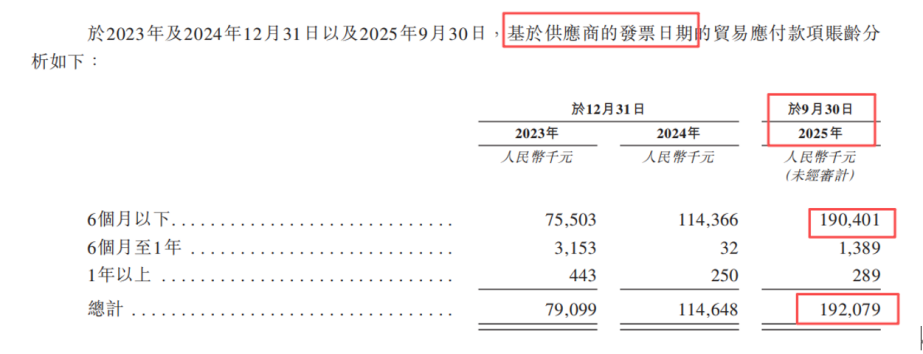 数据显示,2023年至2025年9月末,比格餐饮的贸易应付款项在21个月内从7900万元涨至1.92亿元,增幅高达143%。尤为关键的是,超过99%的欠款账龄在6个月以下。