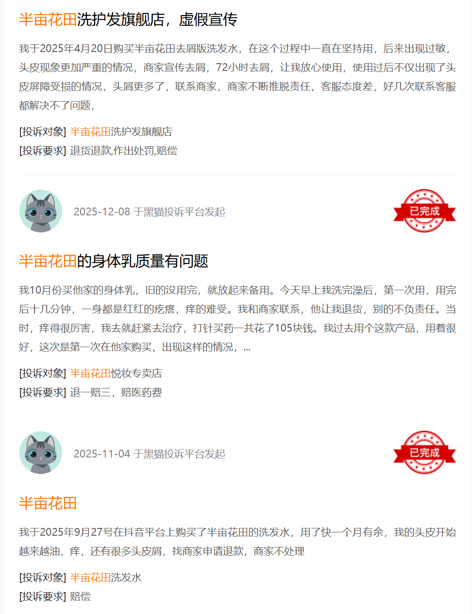 截至发稿,黑猫投诉平台已有 279 条涉及 “半亩花田” 的投诉,主要反映洗发水、洗面奶、身体乳等产品使用后出现过敏、刺激、症状加重等不良反应,同时投诉者普遍提及商家客服回应不及时、态度不佳、解决方案未达预期等问题。