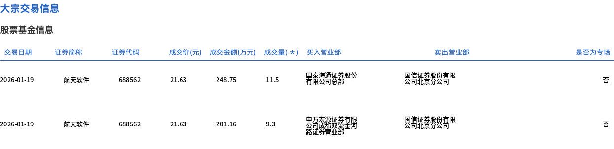 1月19日,航天软件大宗交易成交20.8万股,成交额449.91万元,占当日总成交额的1.19%,成交价21.63元,较市场收盘价24.2元折价10.62%。