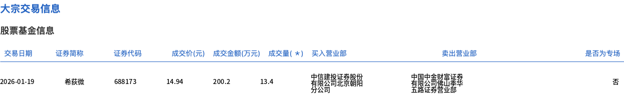 1月19日,希荻微大宗交易成交13.4万股,成交额200.2万元,占当日总成交额的1.28%,成交价14.94元,较市场收盘价16.45元折价9.18%。
