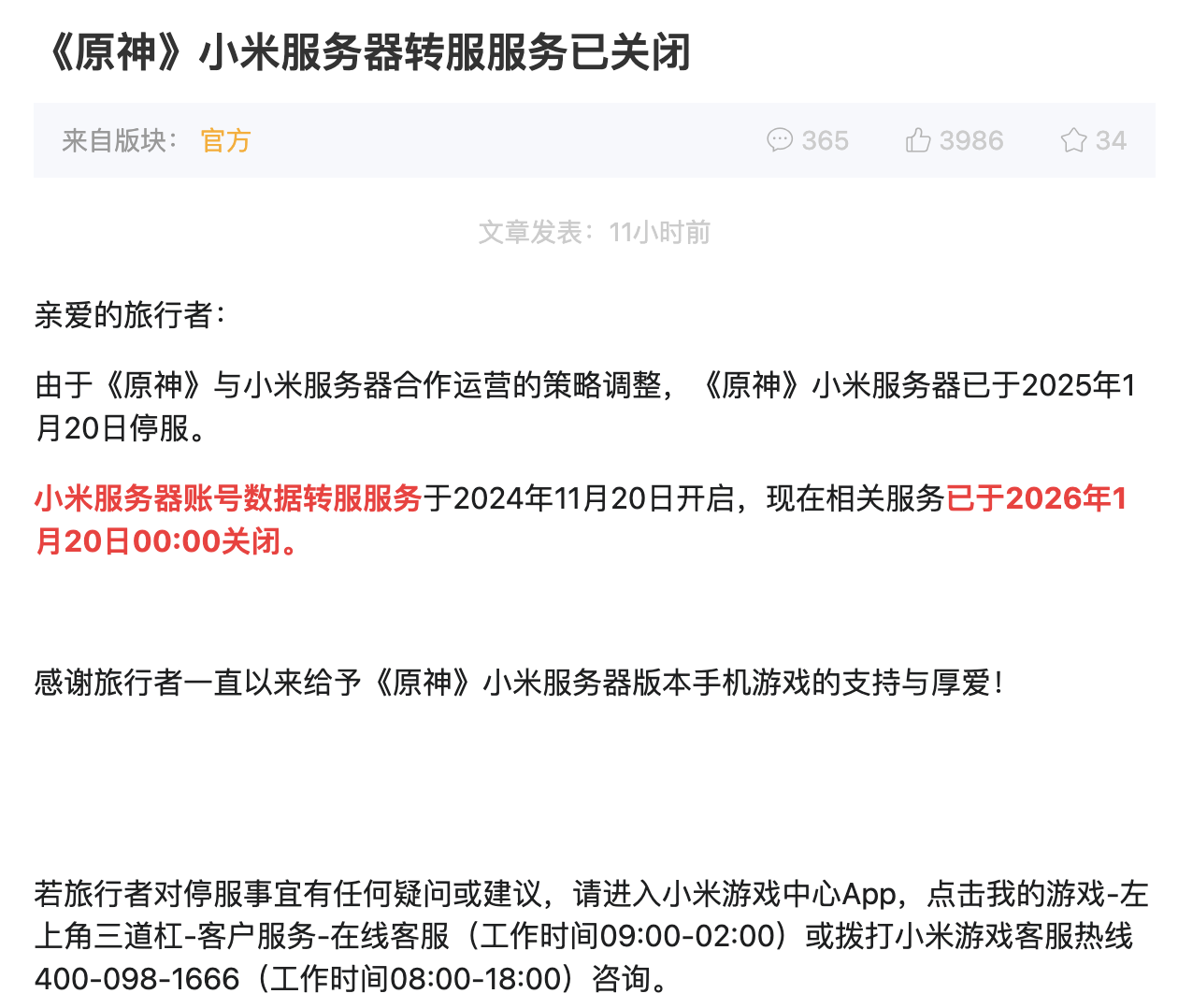 此前由于《原神》与小米服务器合作运营的策略调整,《原神》小米服务器已于2025年1月20日停服。小米服务器账号数据转服服务则于2024年11月20日开启,同步关闭小米服的充值入口与新用户注册。