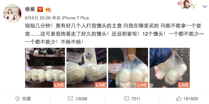 啥叫北京小妞?大概就是杨紫这样,微博画风堪比朋友圈,买了12个馒头也能嘻嘻嘻嘻地发一条微博吧。