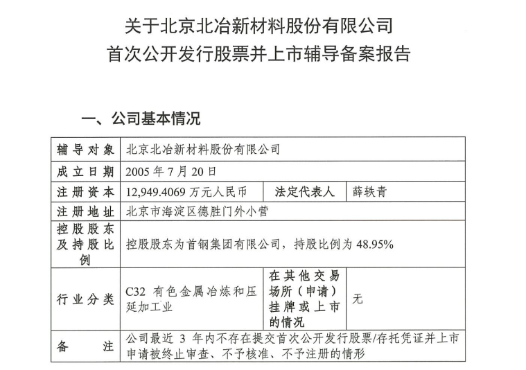证监会网站披露,北京北冶新材料股份有限公司于2026年1月20日在北京证监局办理辅导备案登记,拟首次公开发行股票并上市,辅导券商为中信证券。辅导备案报告显示,该公司控股股东为首钢集团有限公司,持股比例为48.95%。