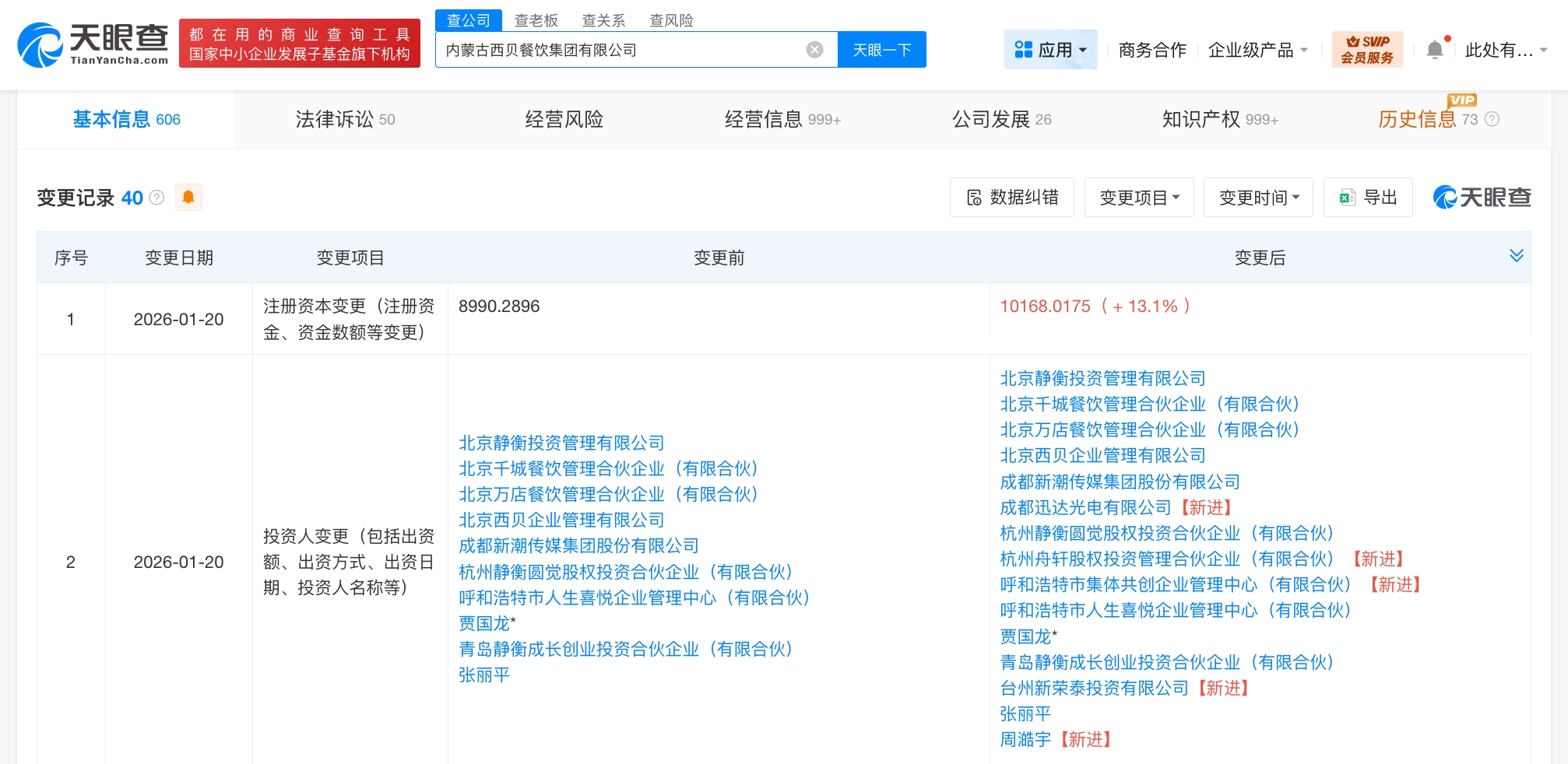 天眼查工商信息显示,1月20日,内蒙古西贝餐饮集团有限公司发生工商变更,新增台州新荣泰投资有限公司、呼和浩特市集体共创企业管理中心(有限合伙)、杭州舟轩股权投资管理合伙企业(有限合伙)等为股东,同时,注册资本由约8990.3万人民币增至约1.02亿人民币,增幅约13%。内蒙古西贝餐饮集团有限公司成立于2017年10月,法定代表人为贾国龙,经营范围含餐饮服务、食品生产、食品互联网销售、食品销售、餐饮管理、企业总部管理、以自有资金从事投资活动等。股东信息显示,该公司由北京西贝企业管理有限公司、贾国龙、呼和浩特市人生喜悦企业管理中心(有限合伙)等共同持股。