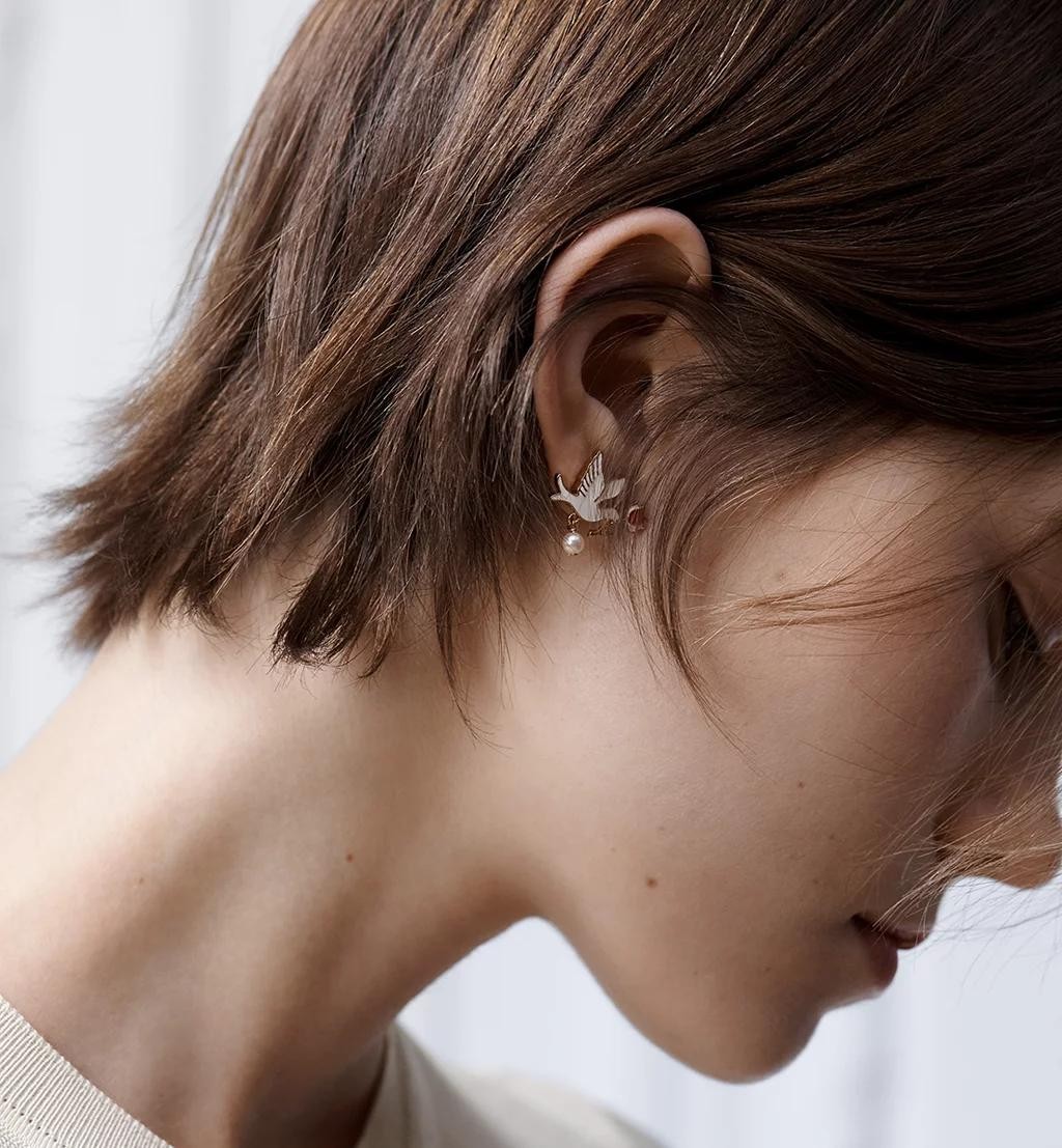 图注:Dioramour限定系列耳环,不对称设计融合彩色鸽子、玫瑰与树脂珠饰,宛如耳畔的一幅微型油画,浪漫至极。