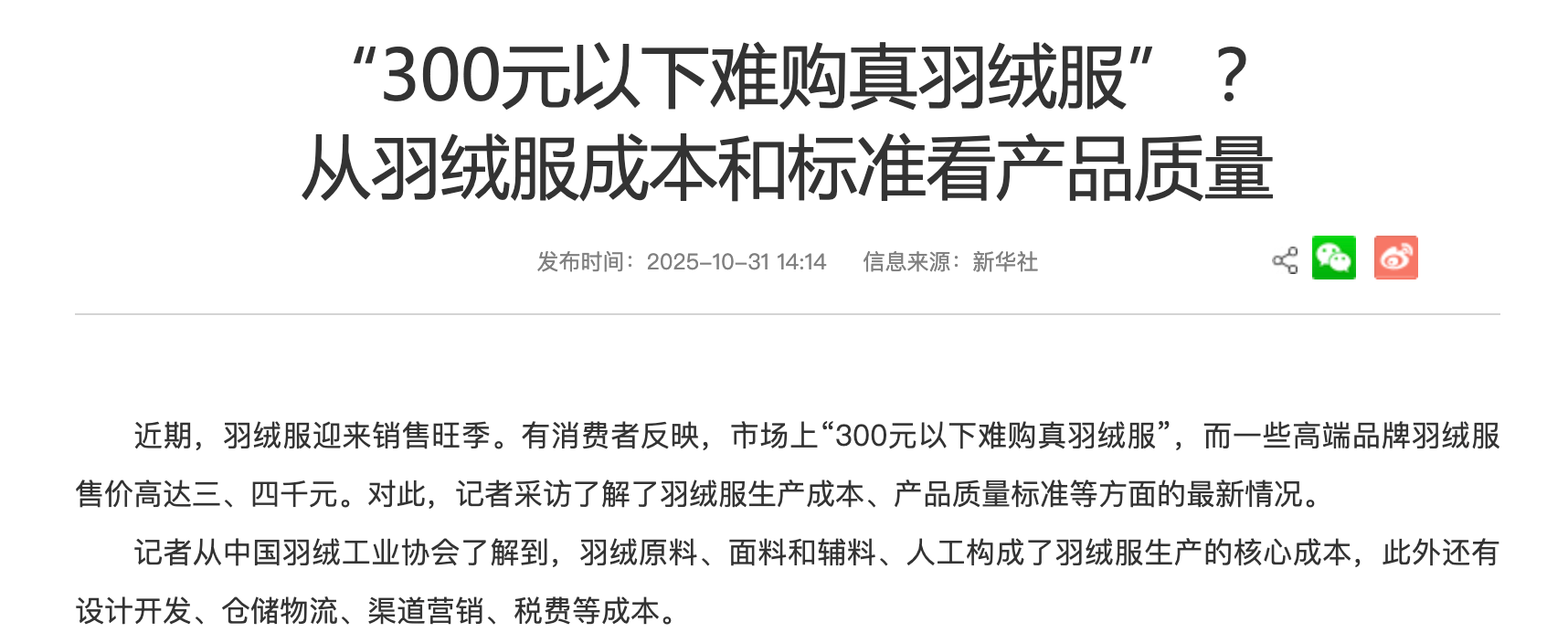 而另一端,千元羽绒服被质疑“质价比偏低”,并不完全源于消费者对价格的排斥,而是因为“看不见的价值”缺乏稳定锚点。当品牌无法把羽绒品质、蓬松效率与结构优势转译为可感知、可验证的体验时,价格就只能被动接受审视。