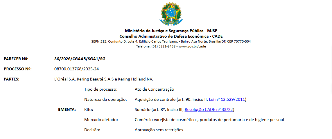 1月21日,据巴西官方公报和巴西反垄断监管机构——巴西经济保护行政委员会(Cade)网站消息,巴西经济保护行政委员会(Cade)下属监督部门已无条件批准欧莱雅与开云集团的交易案。