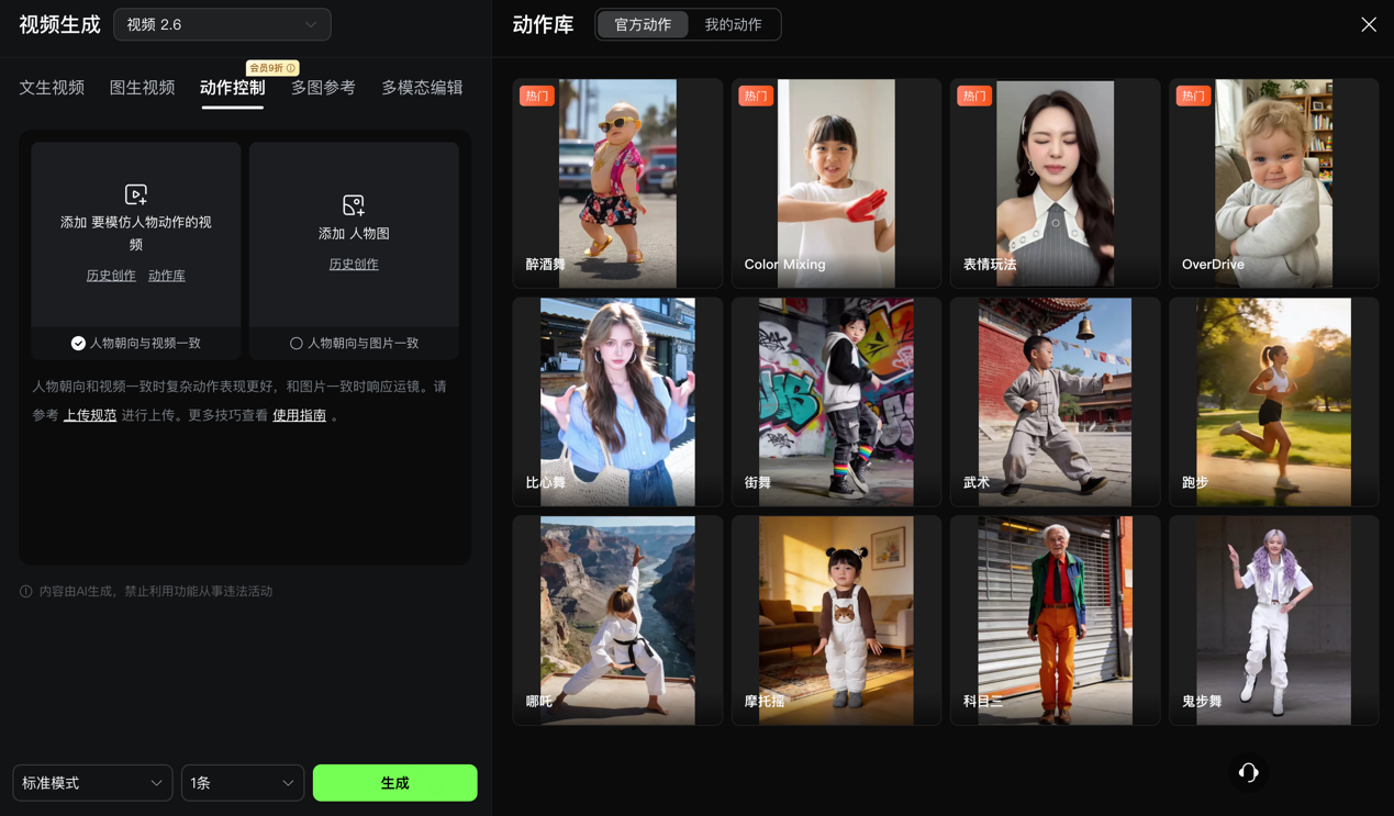 2025年12月17日,可灵2.6模型上线“动作控制”功能,其操作简单却功能强大:创作者只需上传一段参考动作视频(如热门舞蹈、武术招式、人物表情),再导入需要“动起来”的人物或动物图片,AI即可自动完成动作和表情迁移,让静态形象精准复刻参考视频中的姿态与节奏。