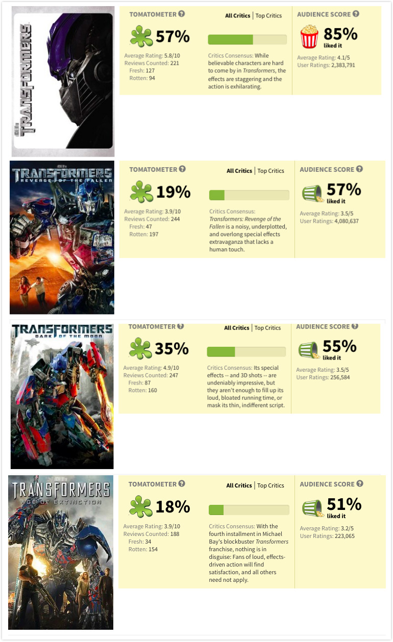 《变形金刚》一直是全球范围的票房收割机,但尽管票房一路上涨,口碑却持续下滑。烂番茄上,《变形金刚》的口碑差的不忍直视。