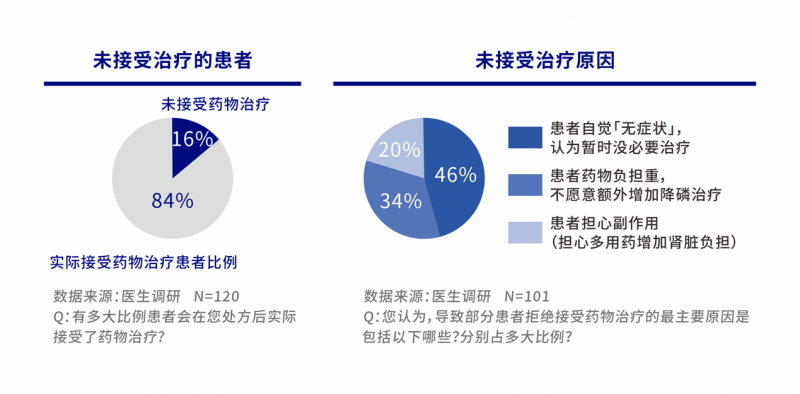 其一,由于认知偏差、依从性差等原因,患者未能得到充分的治疗[3]:包括高磷血症的「无症状」特性让患者难以直观感知疾病危害与治疗获益;坚持饮食控磷的难度太高;现有一些治疗药物的副作用(以便秘、腹痛、腹胀、恶心、胃肠道出血等胃肠道副作用为主)令人担忧,以及治疗负担重等等。