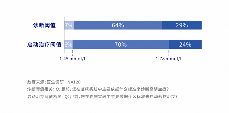 其二,医患对血磷监测的重视程度不足,且药物治疗阈值偏高,干预时机严重滞后:我国仅 14.9% 的透析患者能达到每月一次的血磷监测频率,而日本这一比例高达 93.0%[4]。共识推荐的血磷干预阈值与诊断标准一致,均为>1.45 mmol/L。但调研显示,临床实践中的治疗标准远较此宽松:仅 6% 的医生会严格遵循符合指南,在血磷>1.45 mmol/L时即开始药物治疗。不符合指南的医生中,70% 的医生将起始治疗线设定在1.45-1.78 mmol/L之间,更有 24% 的医生到血磷水平>1.78 mmol/L才会考虑药物干预。