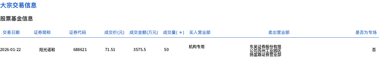 1月22日,阳光诺和大宗交易成交50万股,成交额3575.5万元,占当日总成交额的14.15%,成交价71.51元,较市场收盘价72.6元折价1.5%。